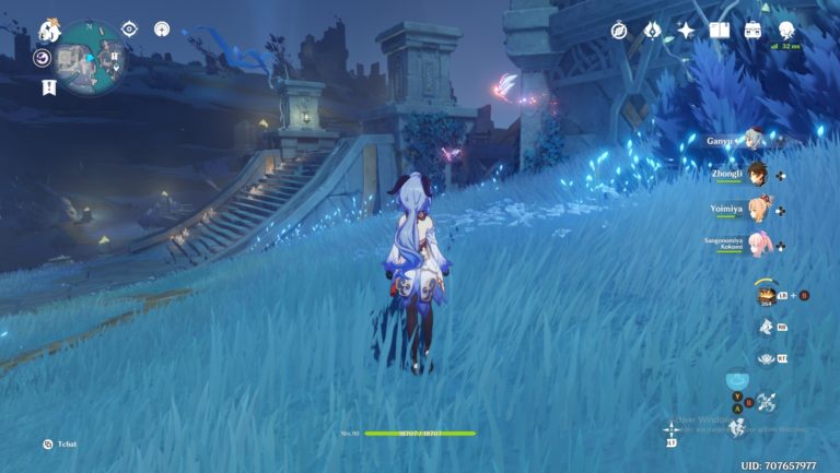 Arrivé là-bas, après avoir purifié et débloqué le téléporteur, un des fantômes du passé d’Enkanomiya vous donne un indice : il vous faut suivre une fée Électro jusqu’à votre destination. Vous croisez des Gardien des ruines et des Éclaireur des ruines gardant des coffres, mais surtout de nouveaux monstres jamais rencontrés auparavant : des Carapaces sombres.