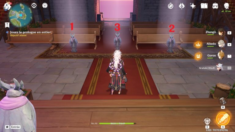 Interagissez de nouveau avec le panneau et sélectionnez l’option « Assister à la seconde moitié ». Cette fois-ci, trois statues se présentent à vous : placez-les dans le faisceau de lumière en suivant l’ordre indiqué ci-dessous :