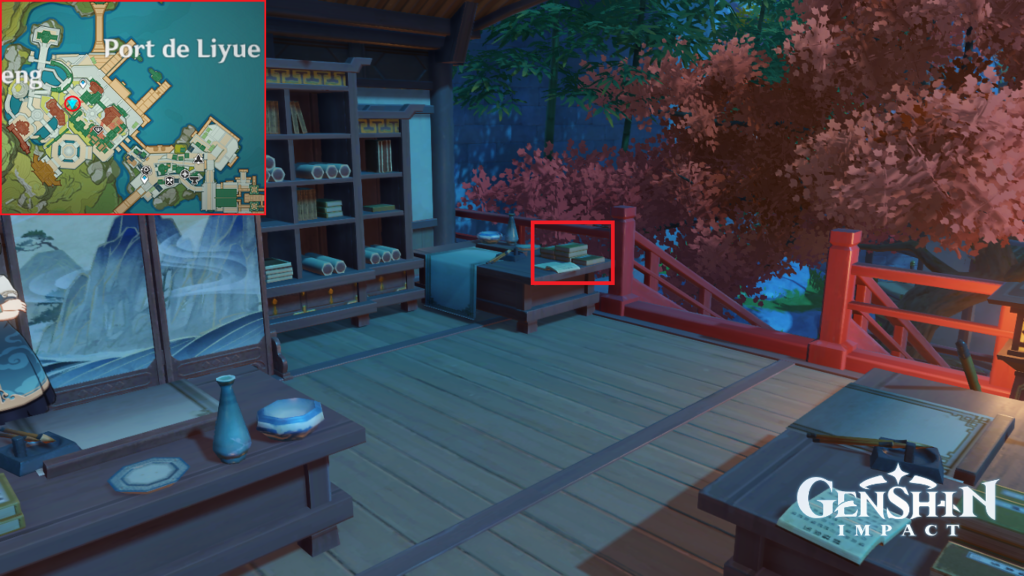 Mora à la Librairie Wanwen, au Port de Liyue.